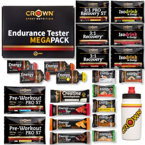 Tasting pack with the 23 most important Crown Sport Nutrition products for endurance athletes, designed to meet all your energy, hydration, and recovery needs before, during, and after training.