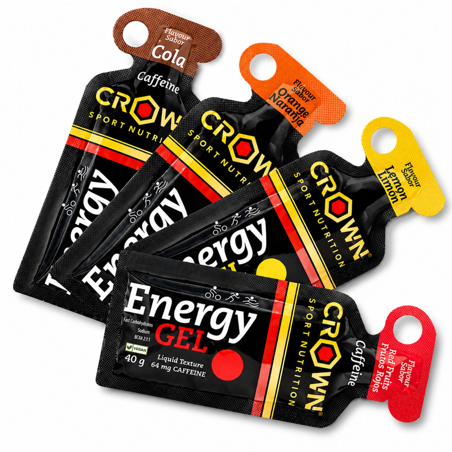 Contiene 3 geles energéticos de cada uno de los 4 sabores: cola con cafeína, frutos rojos con cafeína, limón sin cafeína, naranja sin cafeína. Todos son veganos y libres de alérgenos.
