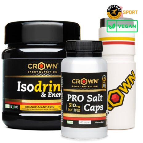 Nuevo pack para los amantes de los deportes de resistencia compuesto por un bote de Isodrink & Energy, un bote de PRO Salt Caps y un bidón de entrenamiento ELITE de 550 ml.